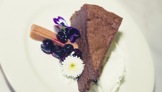 - Dark chocolate and almond tort with a rhubarb and blueberry compote
