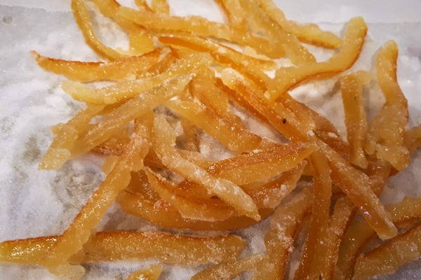 Set a sieve over a bowl and drain the peel, reserving the cooking water. Add 100g sugar to each 100ml water you have. Pour into a pan and gently heat, stirring to dissolve the sugar. Add the peel and simmer for 30 mins until the peel is translucent and soft. Leave to cool in the syrup, then remove with a slotted spoon and arrange in 1 layer on a wire rack set over a baking sheet. Put in the oven at the lowest setting for 30 mins to dry.