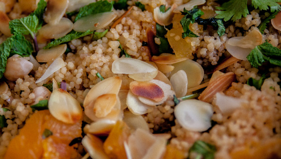 Couscous with roasted harissa vegetables feta cheese, and pumpkin seeds
