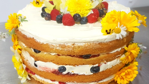 Traditional Victoria sponge cake filled with double cream or buttercream and fresh raspberry conserve.