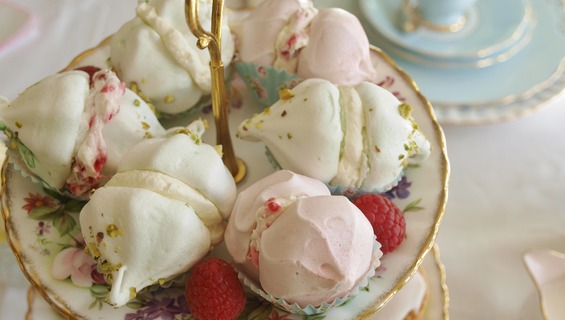 Pistachio meringues with chantilly cream and fresh raspberries/nuts