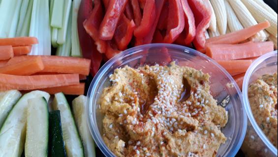 - Harissa hummus, feta, with roasted vegetables and baby spinach/ veg