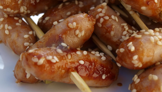 - Mini cocktail sausages with a honey and sesame seed glaze.
