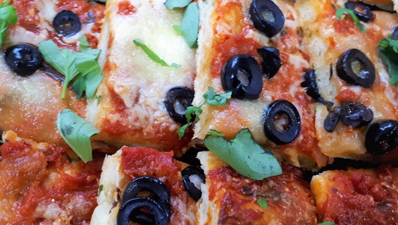 - Scone pizza with passata, mushrooms, black olives, basil, and mozzarella/Veg