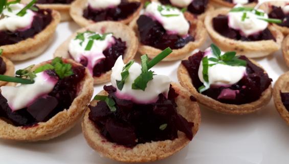 - Crostini tartlets with roasted beetroot, redcurrant jelly, and crème fraiche