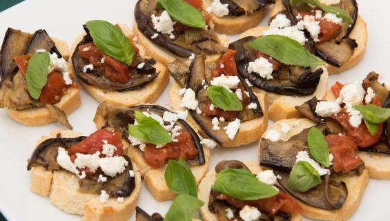 - Bruschetta topped with roasted tomatoes, mozzarella and basil