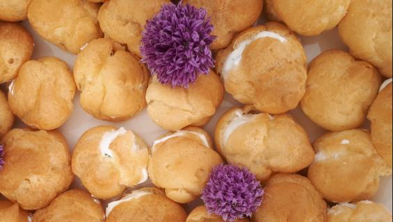 - Mini cheese and chive scone with soft goat's cheese and onion chutney